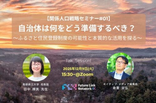 株式会社フューチャーリンクネットワーク(本社:千葉県船橋市、代表取締役:石井丈晴、以下FLN)は、自治体・地域事業者などの関係者に向けたオンラインセミナー「関係人口戦略セミナー#01 自治体は何をどう準備すべき?〜ふるさと住民登録制度の可能性と本質的な活用を探る〜」を、2025年12月9日(火)に開催します。