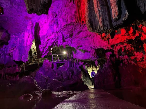 満奇洞内でVTuberのイメージカラーにあわせた特別ライトアップを実施